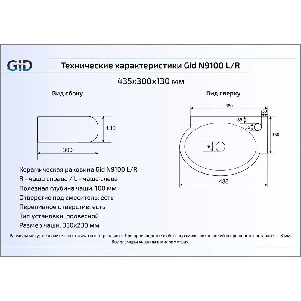 Подвесная раковина правая 43.5x30х13 см, Gid, N9100R 5 800 ₽