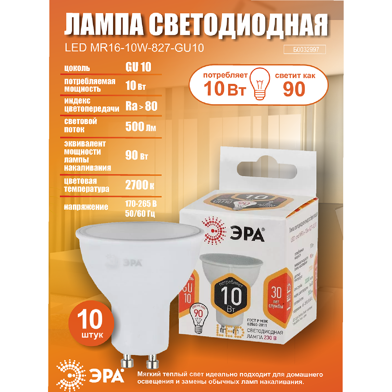 Набор светодиодных лампочек ЭРА LED MR16-10W-827-GU10 2700K софит 10 Вт 10 штук информация: