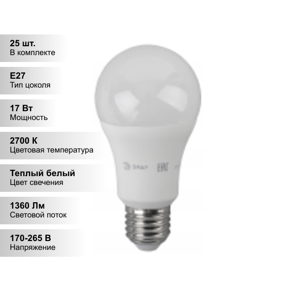 (25 шт.) Светодиодная лампочка ЭРА A60 17Вт 170-265В 2700К E27 информация: