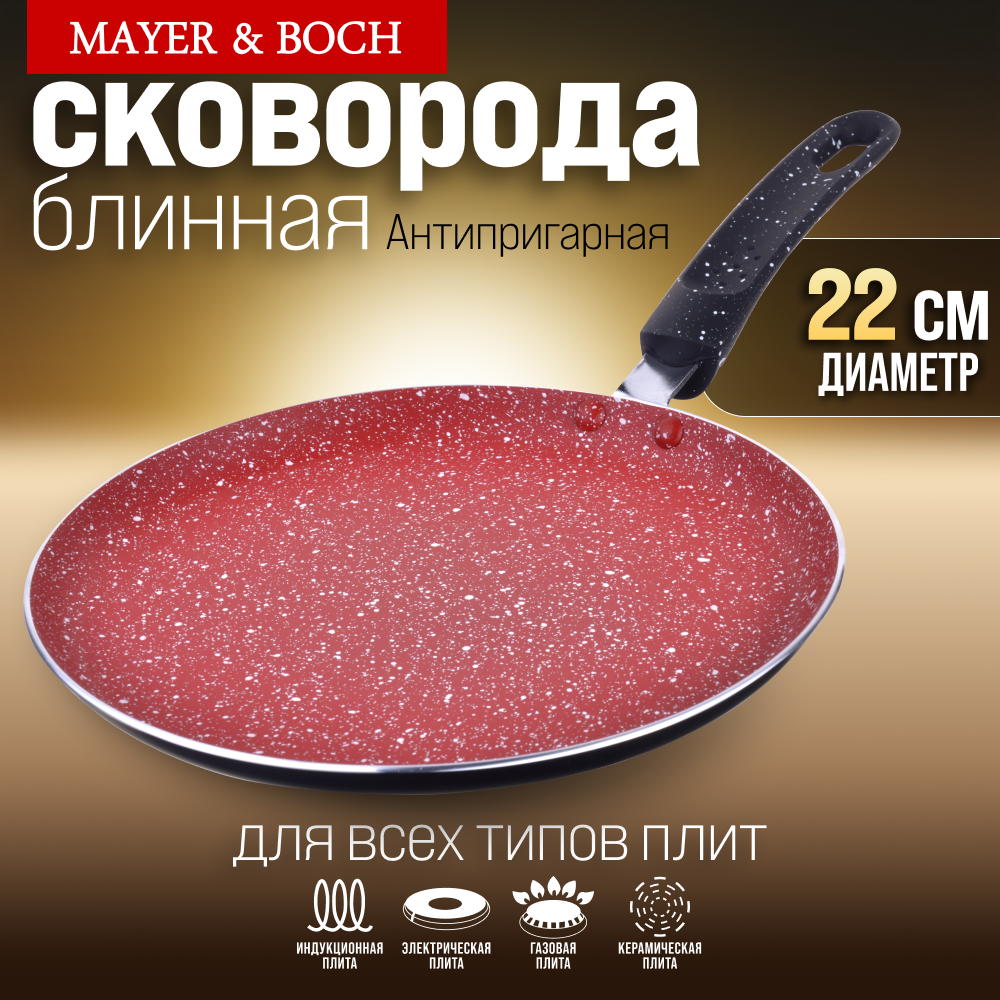 Сковорода для блинов Mayer&Boch / Майер Энд Бош 25686 антипригарное покрытие алюминий, диаметр 22см / сковородка блинная / блинница для всех видов плит