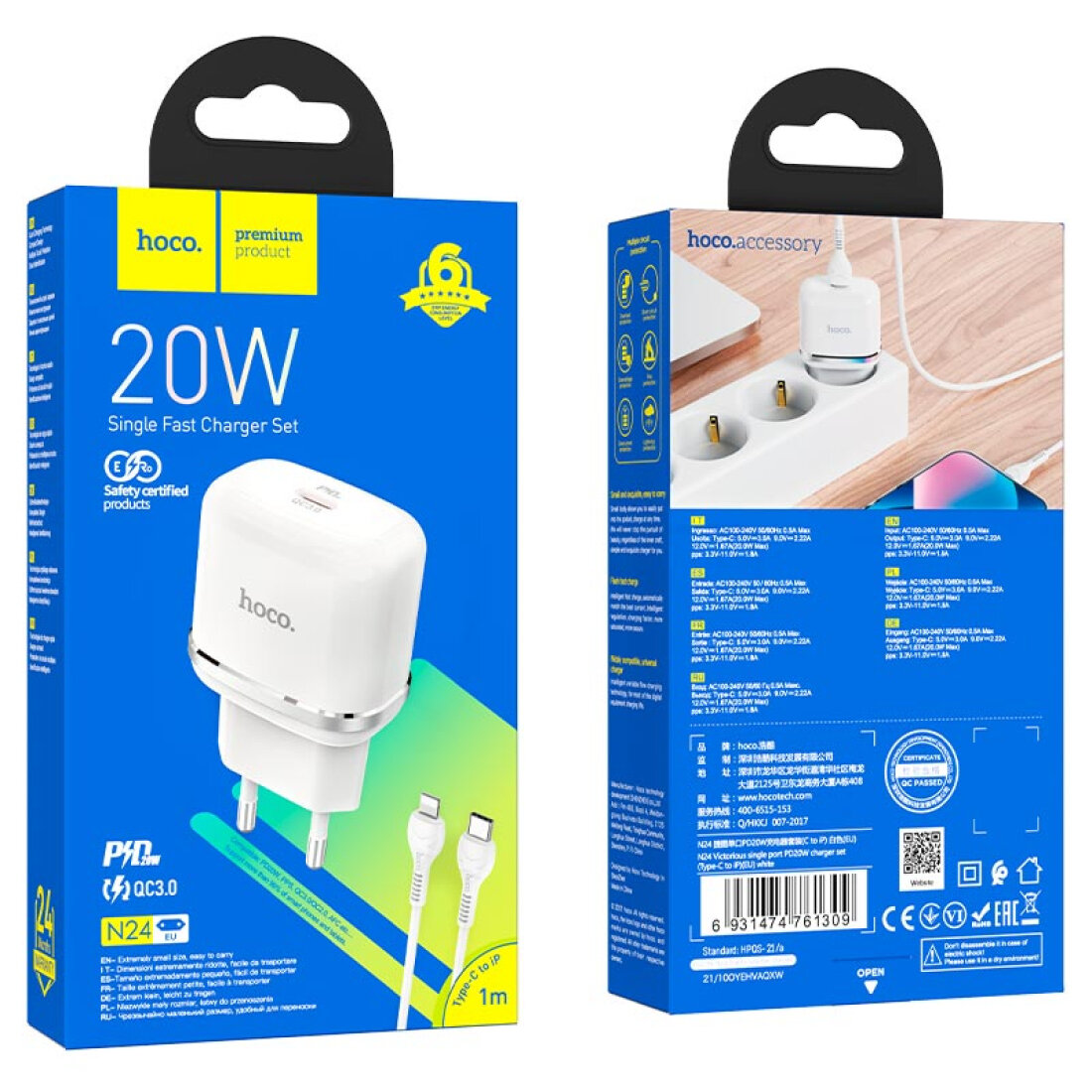 HOCO N24 Victorious singl port PD20W Charger set (Type-c to iphone) (EU) white
