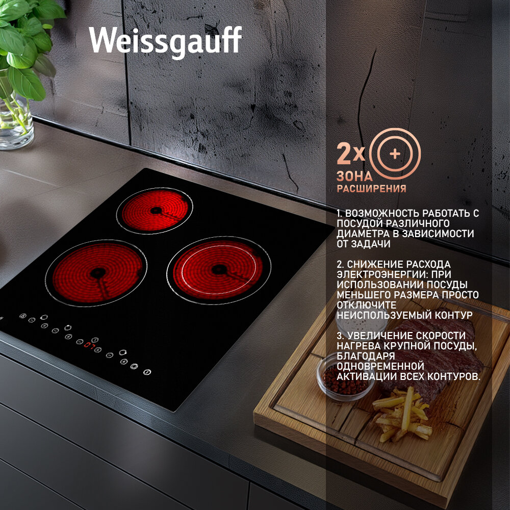 Стеклокерамическая панель Weissgauff HVF 431 B двухконтурная зона нагрева, 3 года гарантии, 45 см ширина, таймер, блокировка от детей информация: