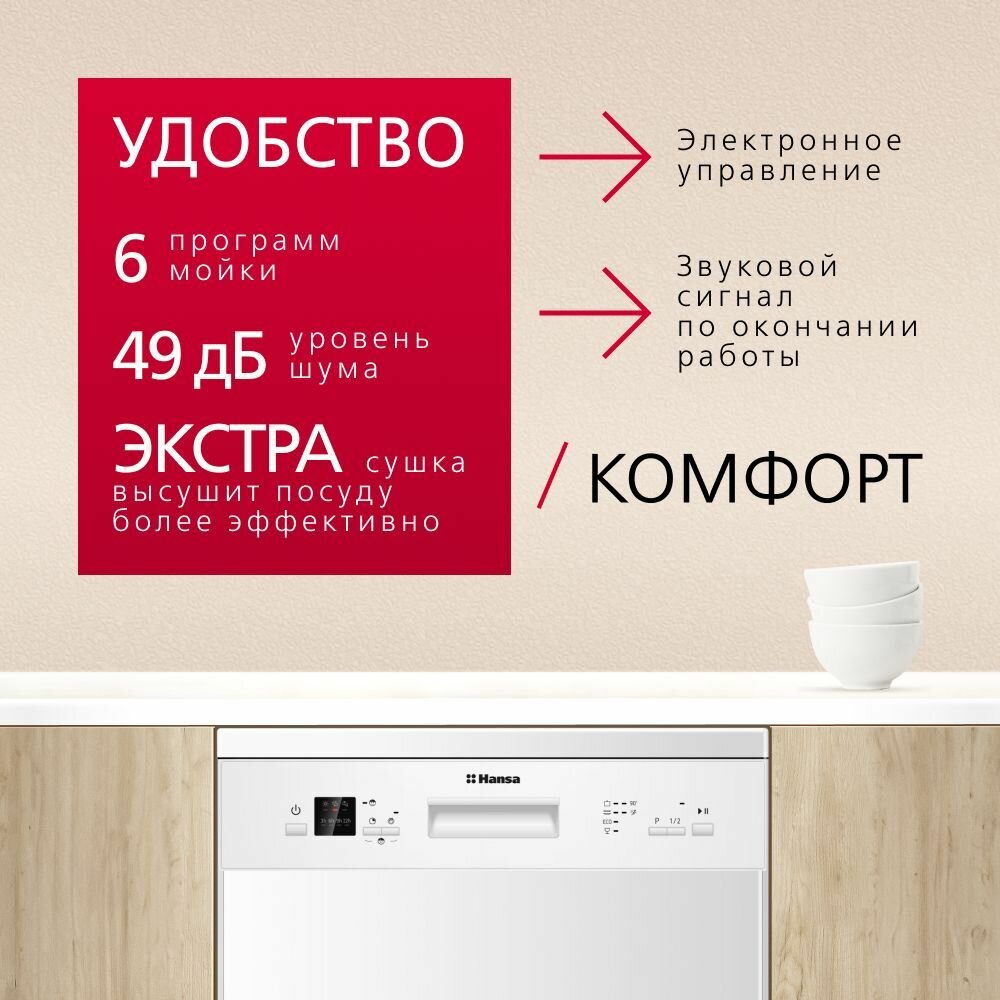 Посудомоечная машина Hansa ZWM656WEH, 60 см., с защитой от протечек, 6 программ, с 3 корзинами, блокировка управления, с режимом половинной загрузки информация: