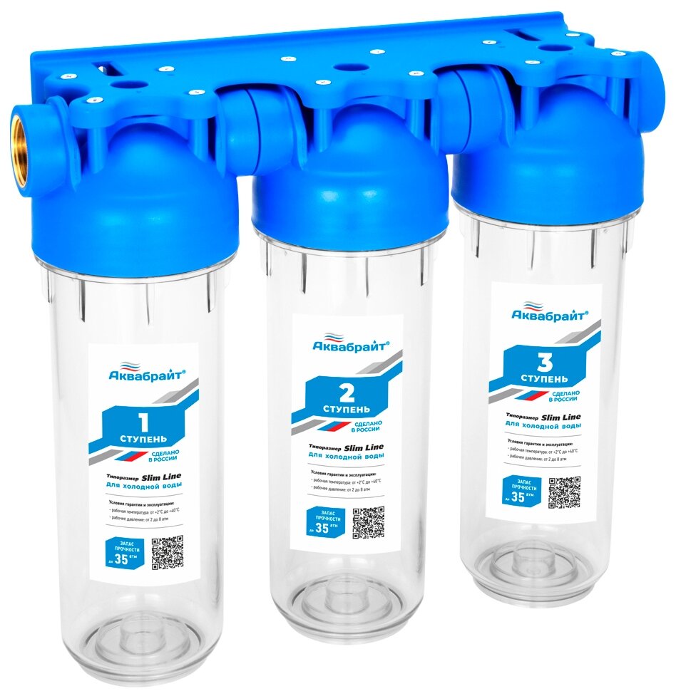 Фильтр для воды 3/4 ", 3-х ступенчатый, прозрачные копруса, Slim Line, в комплекте кронштейн и ключ, аквабрайт АБФ-3 3/4