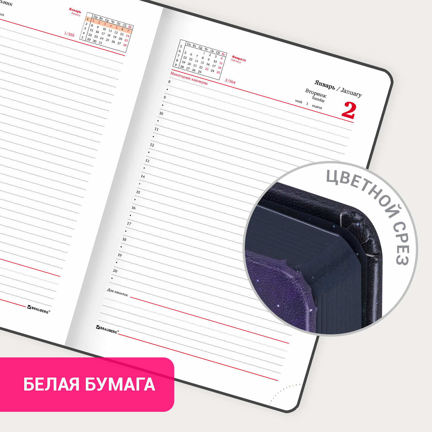 | Особенности | перфорация уголков / справочная информация / поля / ляссе / держатель для ручки |