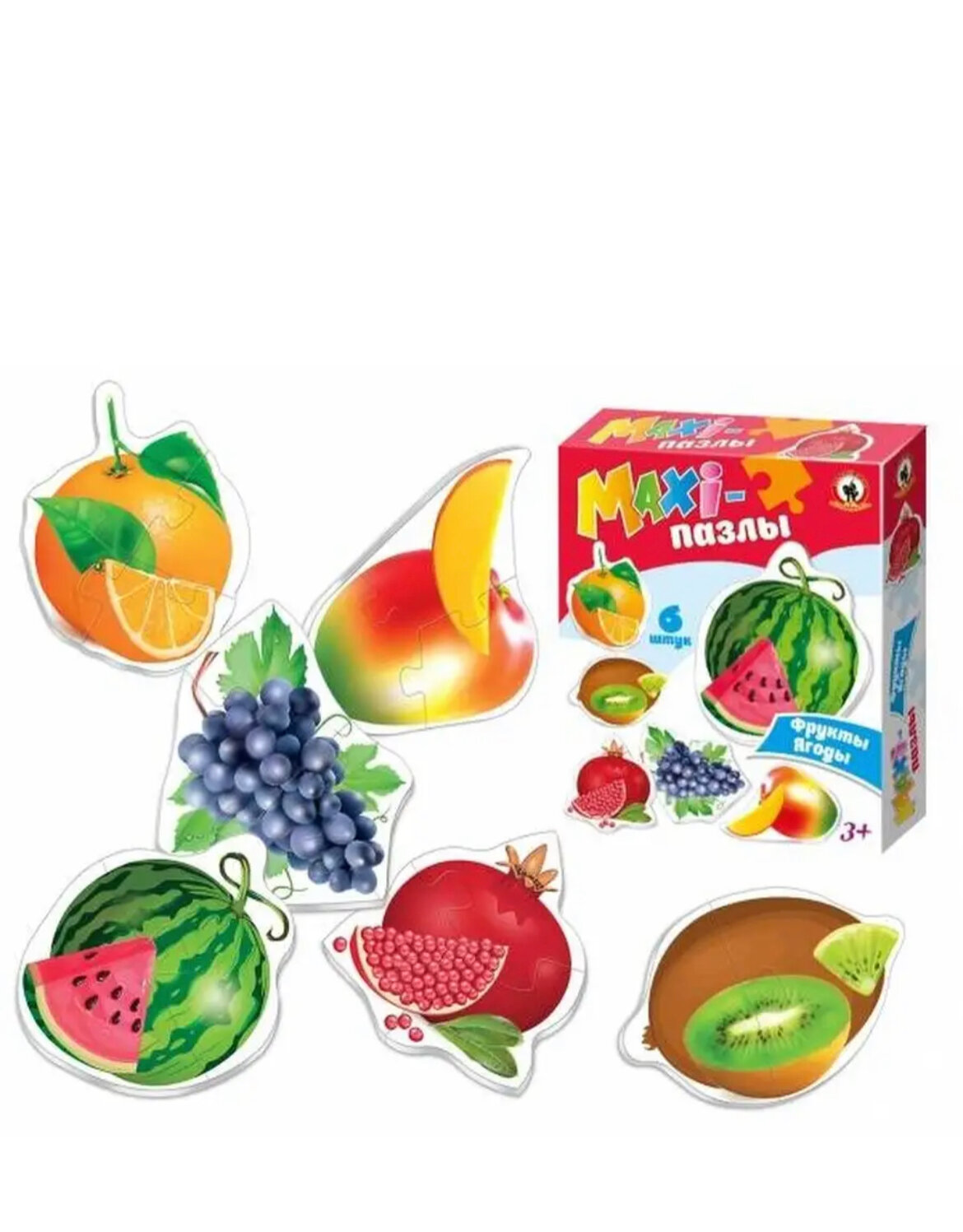 Развивающие макси-пазлы "Фрукты. Ягоды" для малышей, 6 картинок, 18 крупных деталей, развитие моторики, внимания и памяти