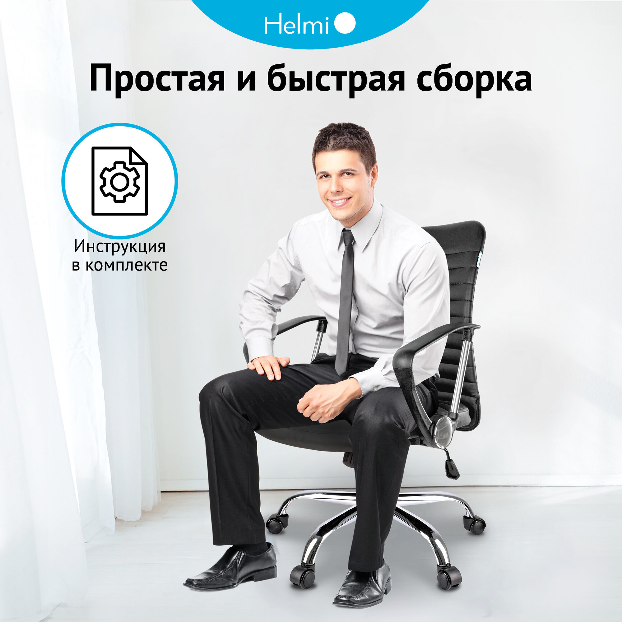 Компьютерное кресло Helmi HL-M09 "Instance"/Мягкое сиденье из черной экокожи, с подлокотниками, на колесиках, с регулируемой спинкой/Офисный компьютерный стул, мебель для дома информация: