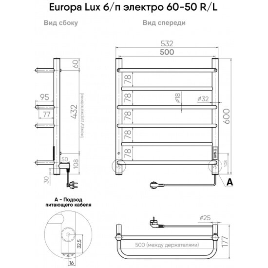 Полотенцесушитель Europe Lux электрический 80/50 таймер, скрытый монтаж, универсальное подключение, Полированный INDIGO