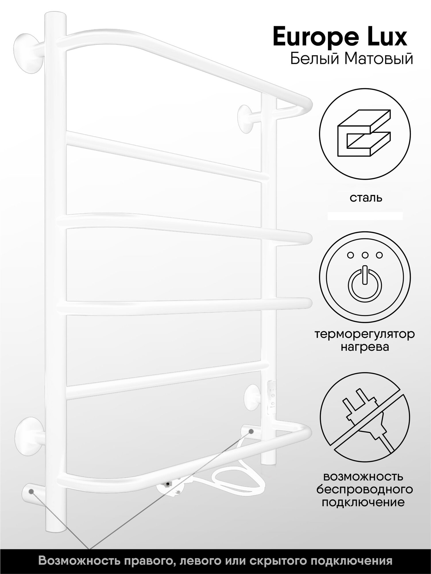 Полотенцесушитель Europe Lux электрический 80/50 таймер, скрытый монтаж, универсальное подключение, Полированный INDIGO