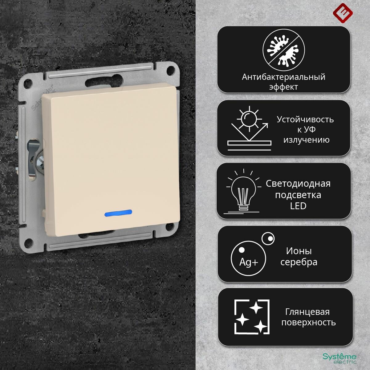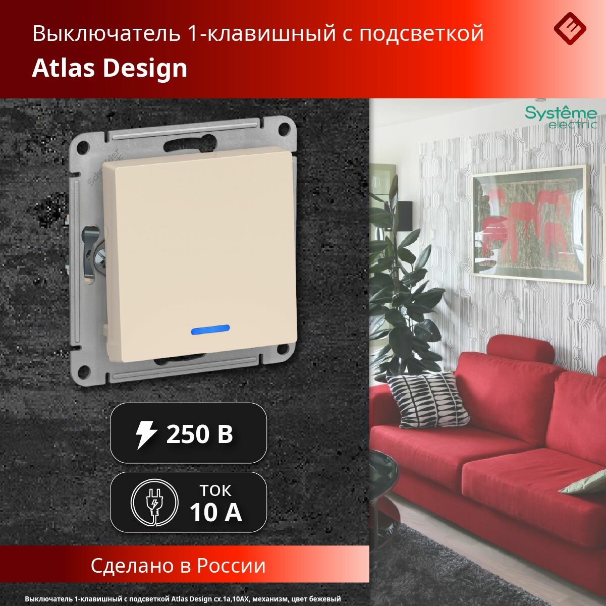 Отзывы на Выключатель одноклавишный с подсветкой (бежевый), сх.1а, 10АХ, механизм Schneider Electric AtlasDesign (комплект 5шт)