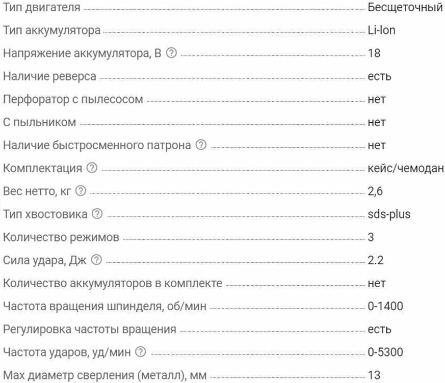 | Комплектация | перфоратор, дополнительная рукоятка, металлический ограничитель глубины бурения, руководство пользователя, гарантийный талон, кейс |