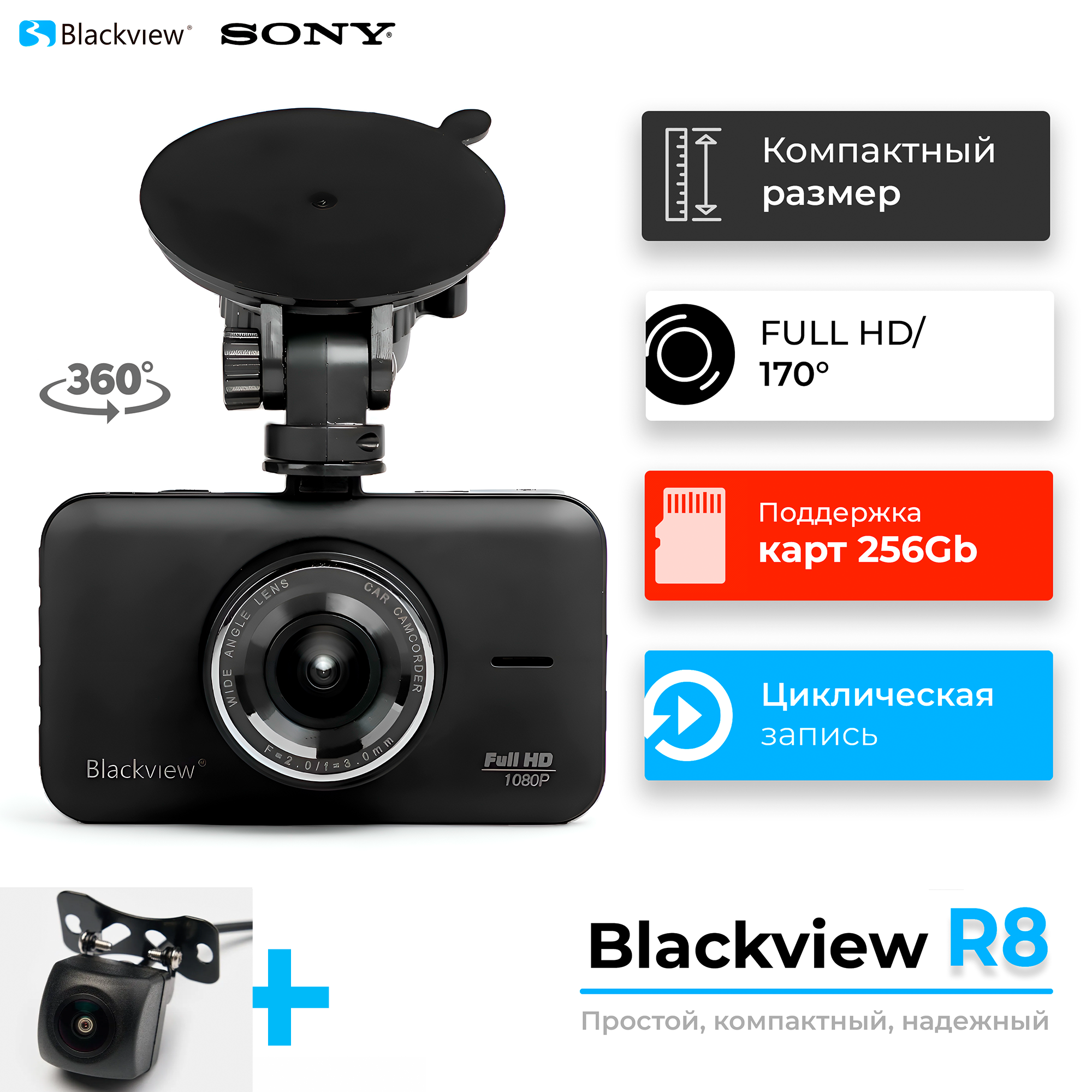 Автомобильный видеорегистратор с камерой заднего вида Blackview R8 DUAL, 2 камеры SONY STARVIS +64 Гб