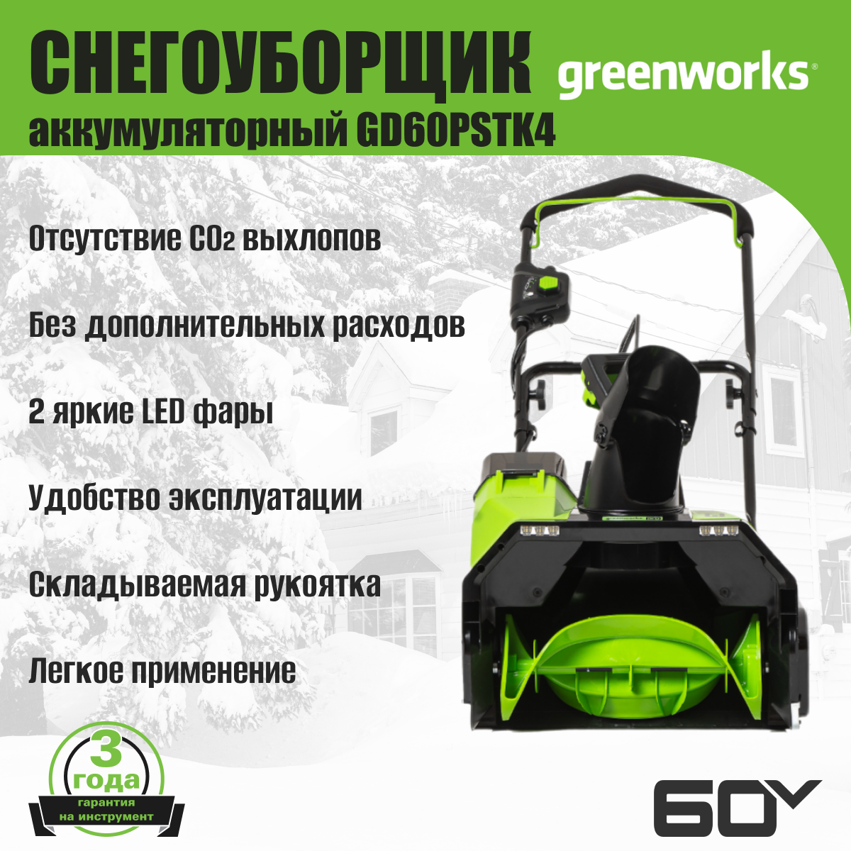 Снегоуборщик GREENWORKS GD60PSTK4, аккумуляторный (2602907UB)
