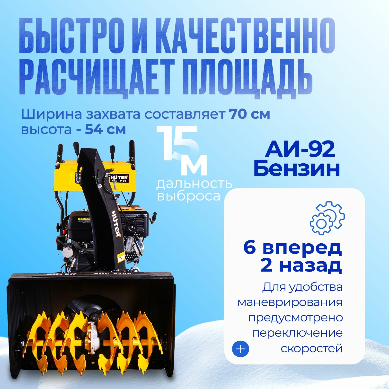 Снегоуборщик HUTER SGC 8100, 13 л.с. ковш 70х54см, 6 вперед/ 2 назад информация: