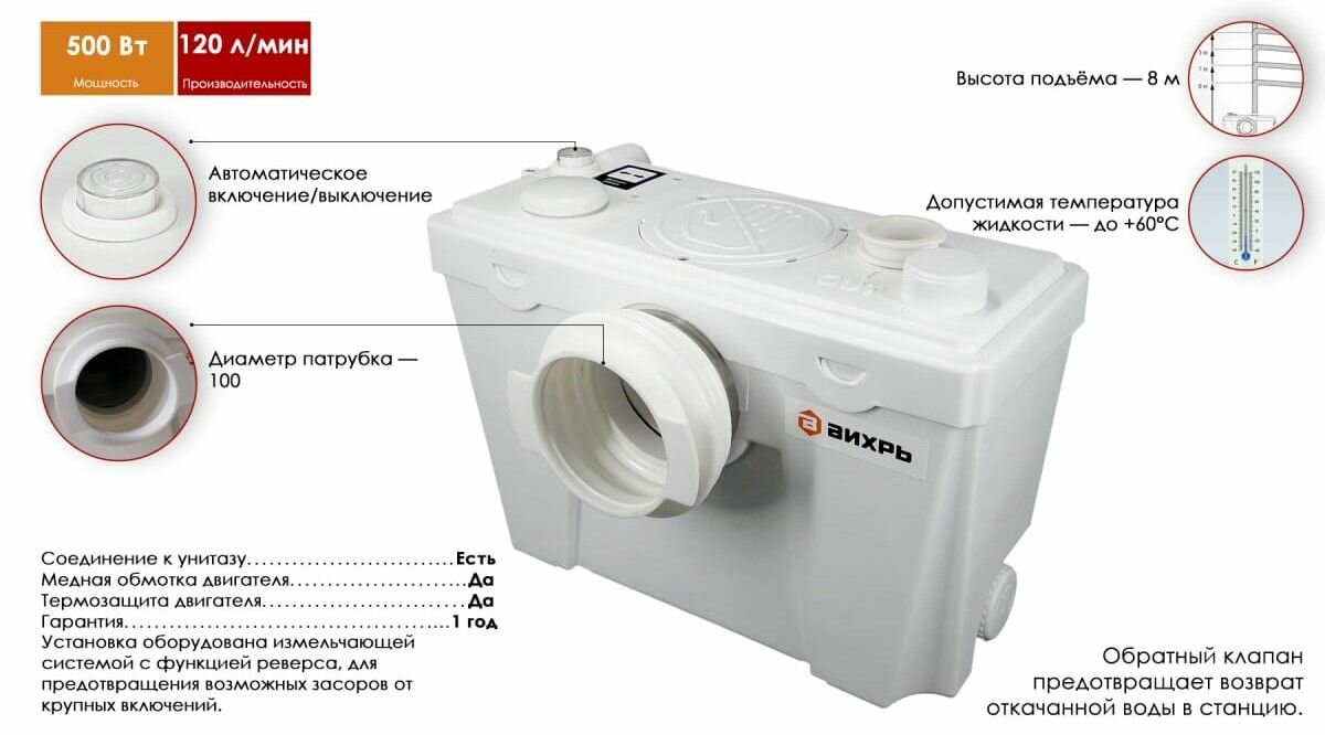 Канализационный насос с измельчителем КН-500 Вихрь (500 Вт, 120 л/мин, макс. напор по вертикали 8 м, по горизонтали 80 м, ножи в наличии) для душа, раковины, кухни, унитаза 18 290 ₽