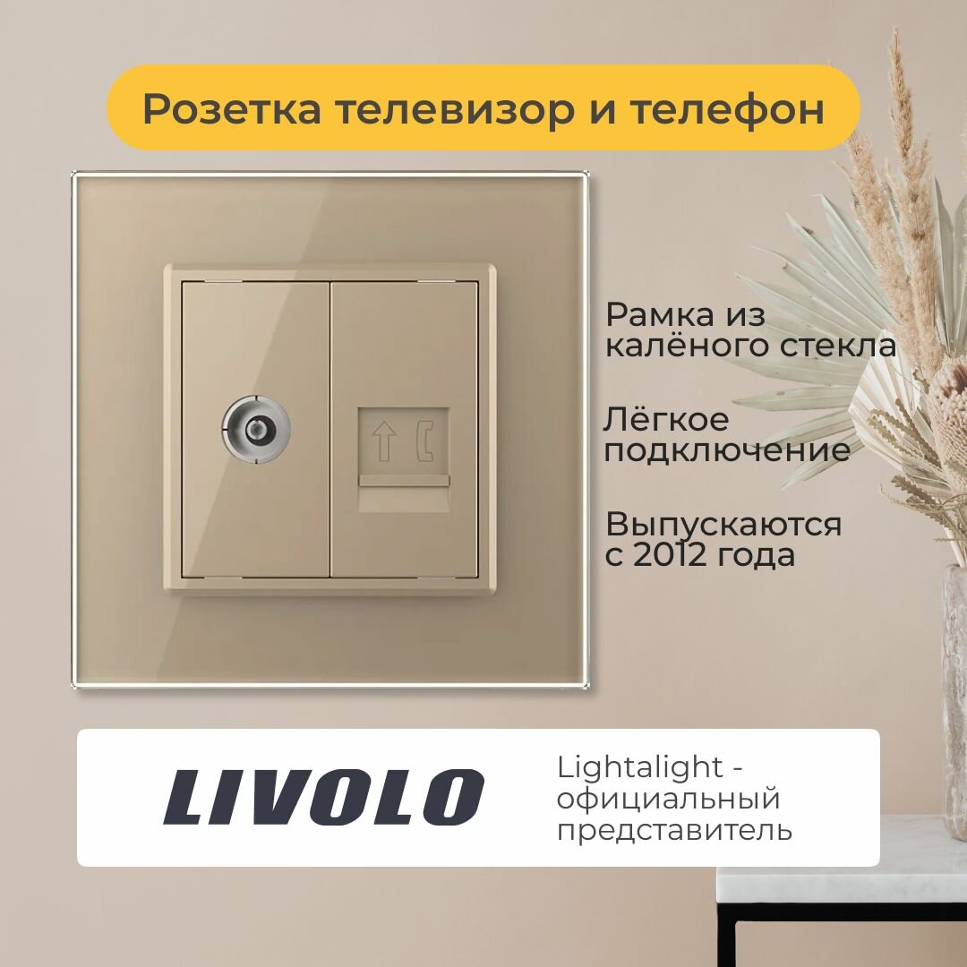 Розетка Livolo, телевизор и телефон, разъемы антенный и RJ-11, стеклянная рамка