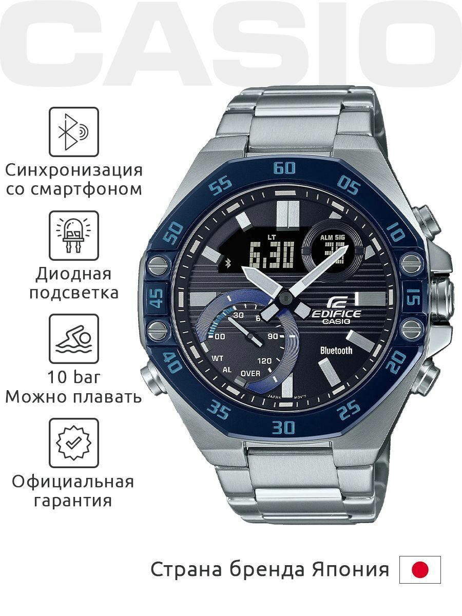 Наручные часы CASIO мужские Edifice ECB-10D-2A кварцевые, встроенная память, будильник, настройка времени с помощью приложения, хронограф, секундомер, таймер обратного отсчета, водонепроницаемые, подсветка стрелок, подсветка дисплея, серебряный