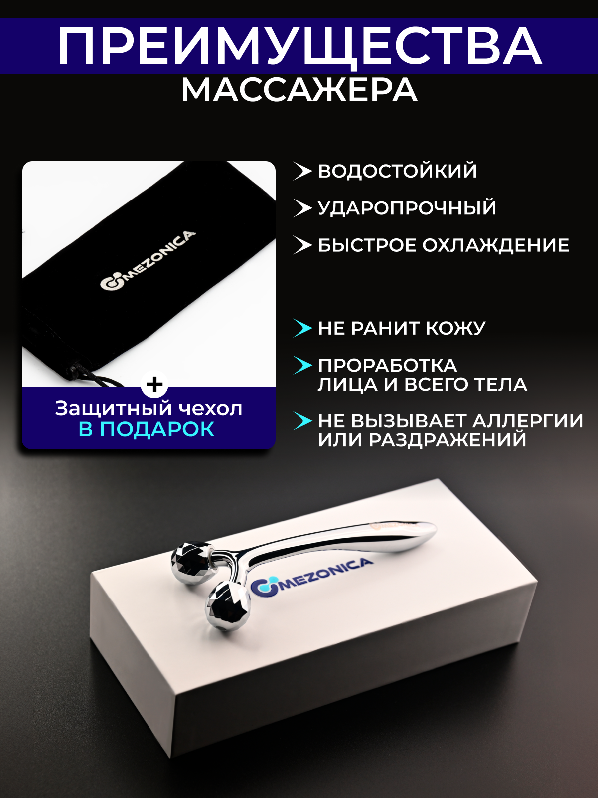 Массажер 2 в 1 роликовый Mezonica, скребок гуаша металлический, для массажа лица, кожи вокруг глаз, декольте 1 281 ₽