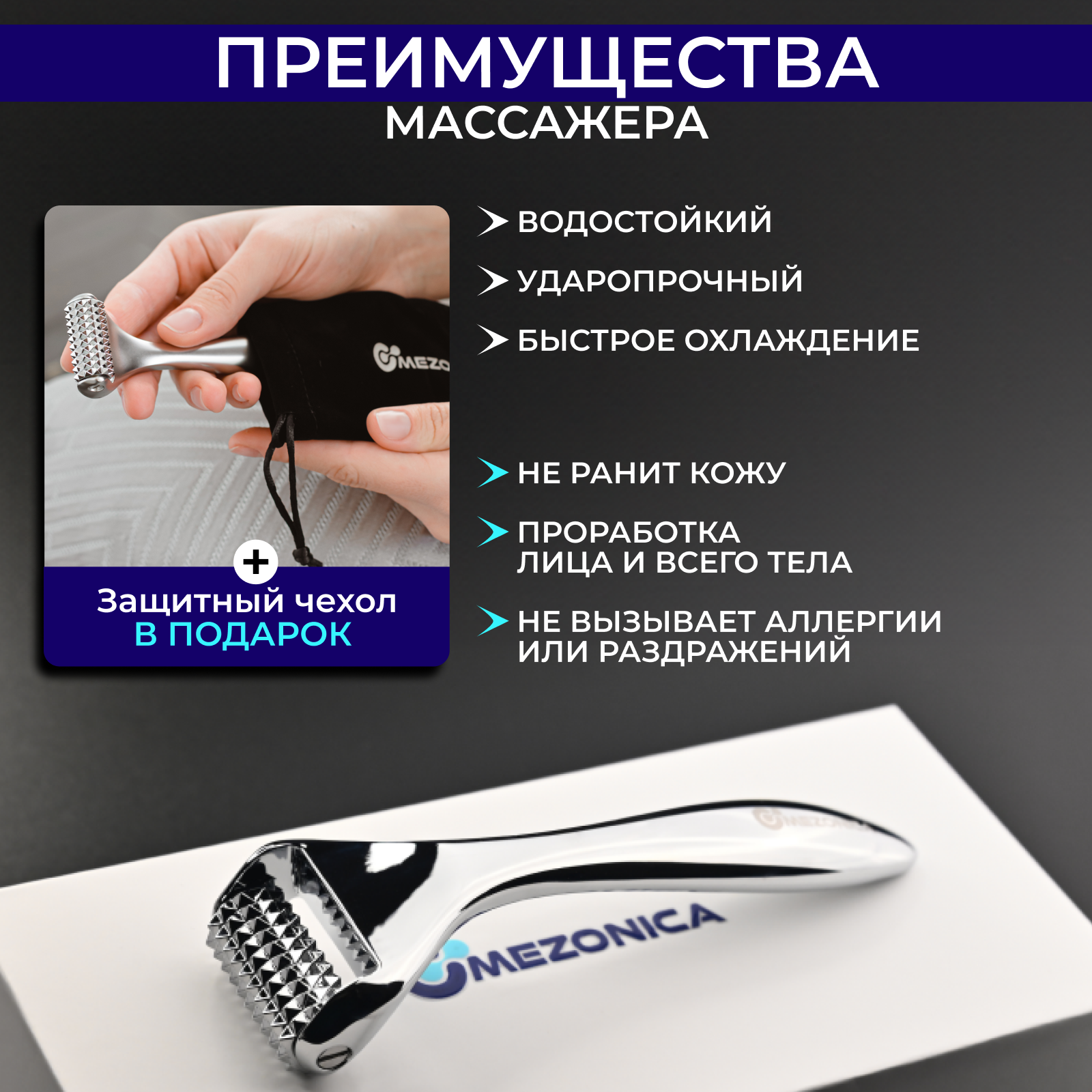 Массажер 2 в 1 роликовый Mezonica, скребок гуаша металлический, для массажа лица, кожи вокруг глаз, декольте 1 281 ₽