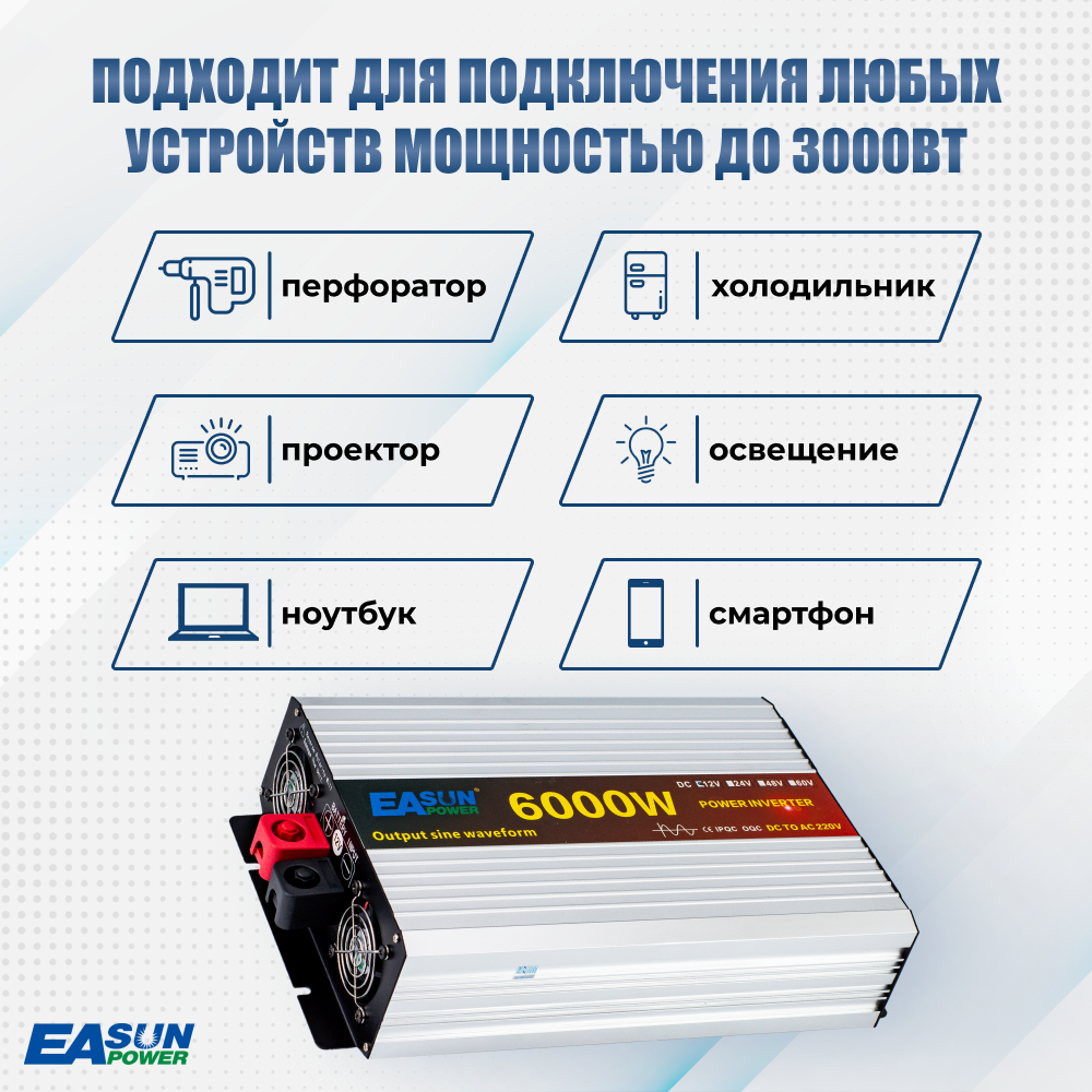 10 цен на Инвертор автомобильный 12 220В, 6000 Вт. EASun Electric. Чистая синусоида. Мощный преобразователь напряжения, трансформатор 12В в 220В.