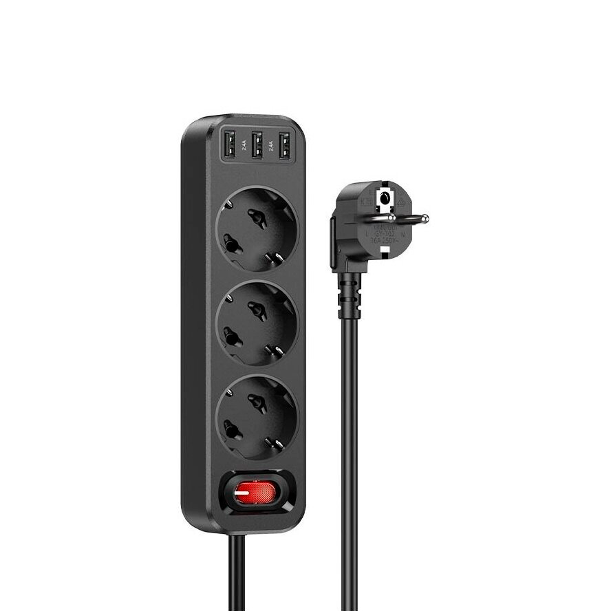 Сетевой фильтр HOCO NS2, черное, 3.0A, 3 розетки, 3 USB выхода, 1,8m