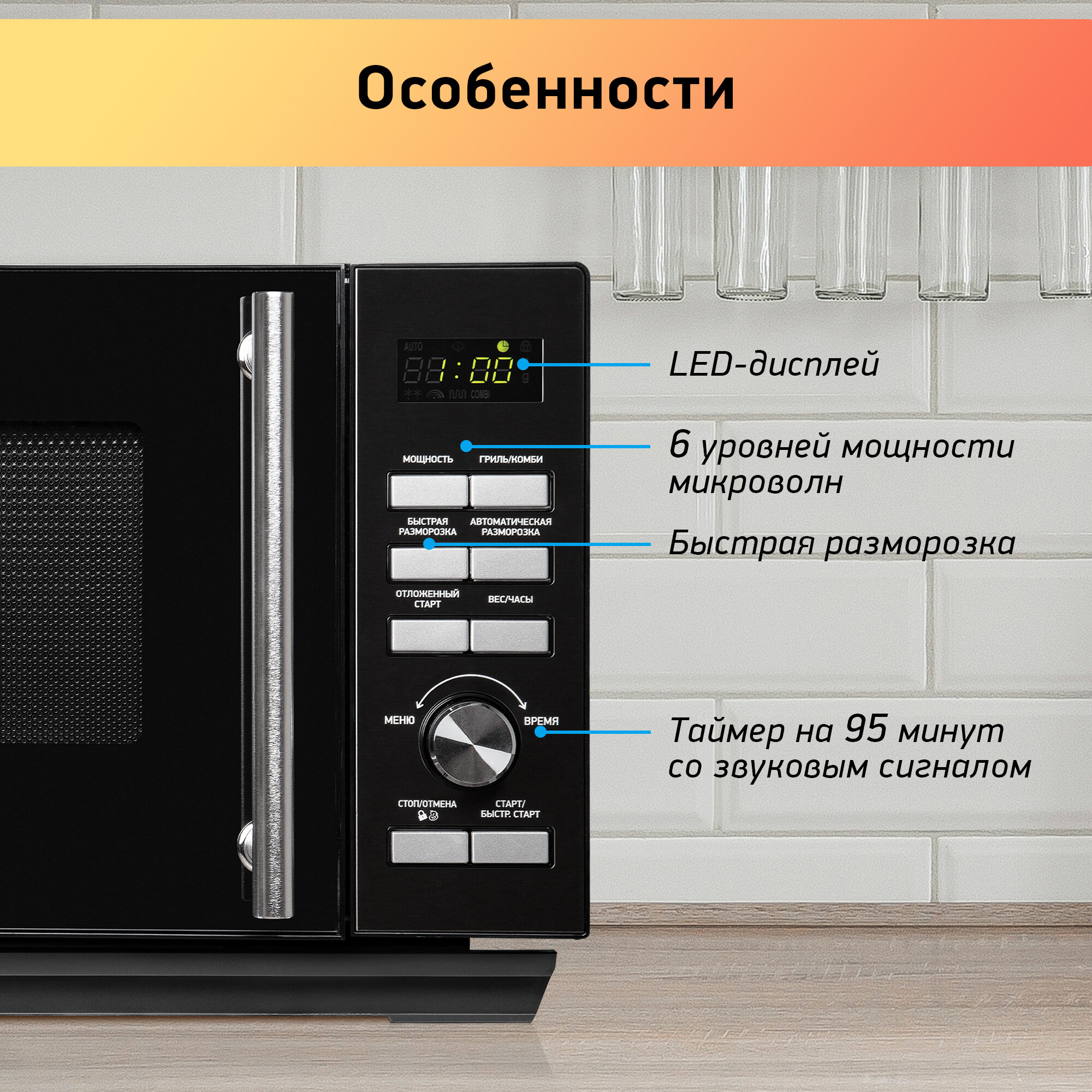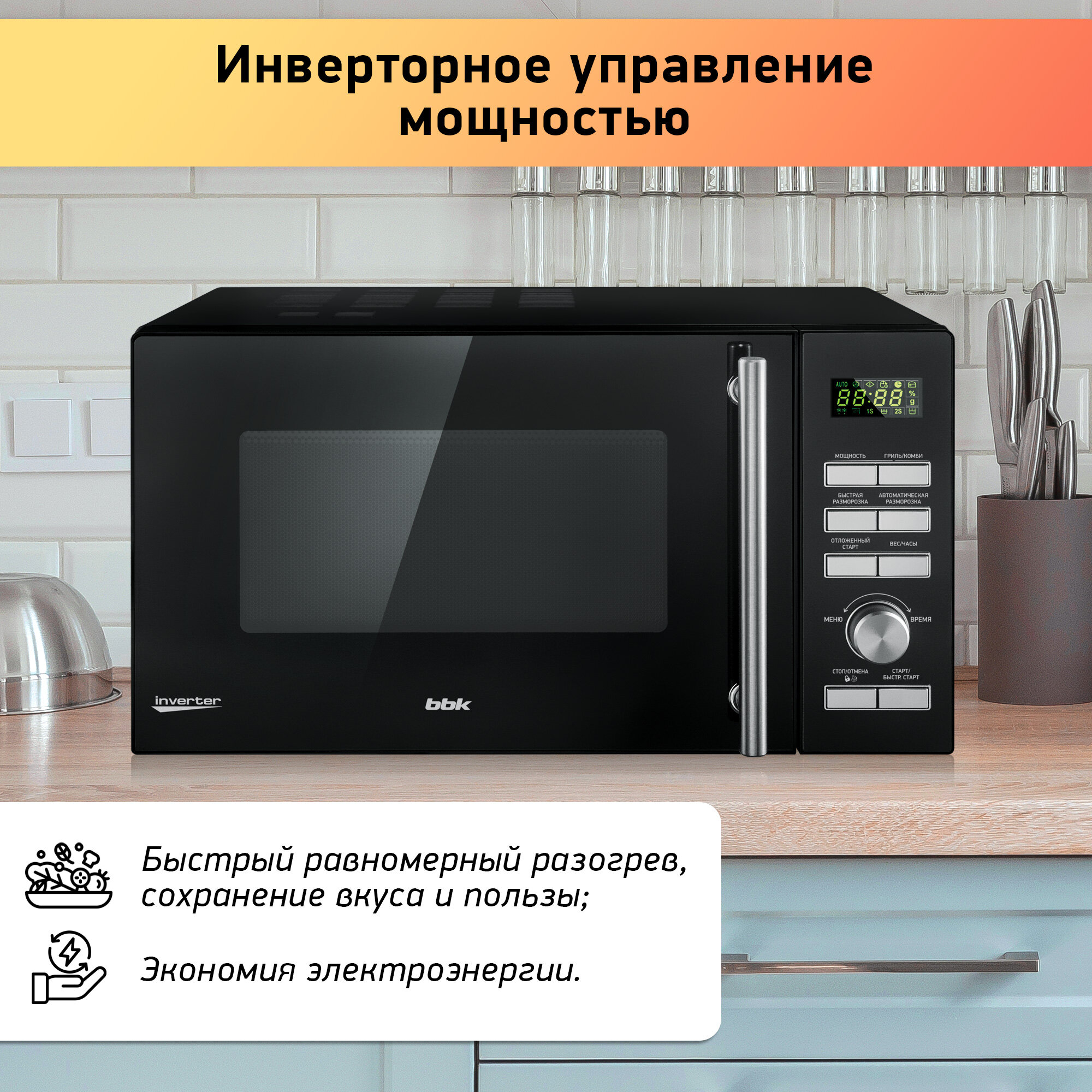 10 цен на Микроволновая инверторная печь с грилем BBK 25MWI-939T/B черный, объем 25 л, мощность 900 Вт, автоменю, блокировка от детей