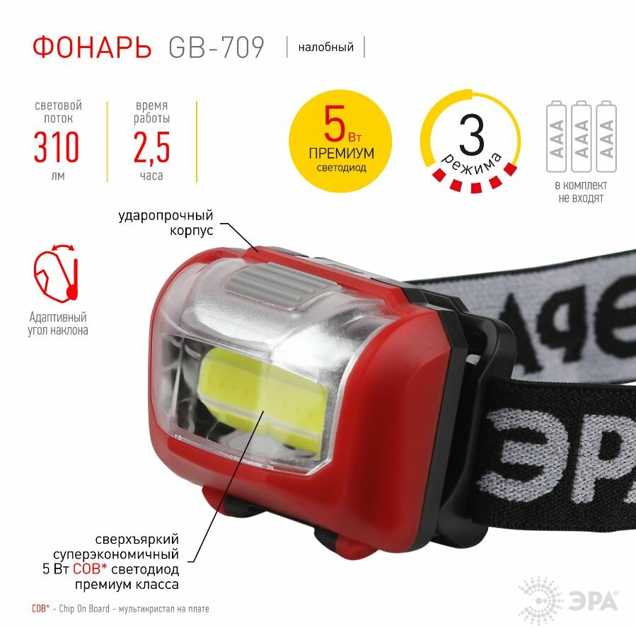 Фонарь налобный светодиодный GB-709 "Пиранья" на батарейках 3 режима 5Вт СОВ 3хААА | код Б0052751 | Эра (1 шт.)