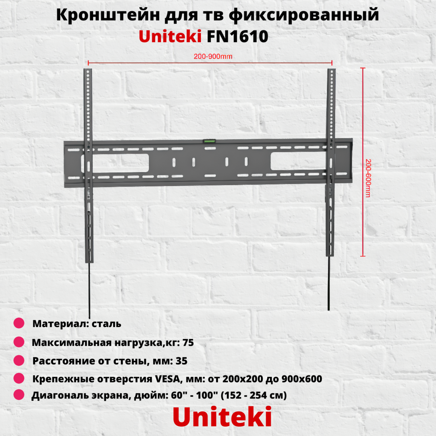 Кронштейн для телевизора UniTeki FN1610 на стену, быстросъемный, фиксированный, диагональ 60-100 дюймов информация: