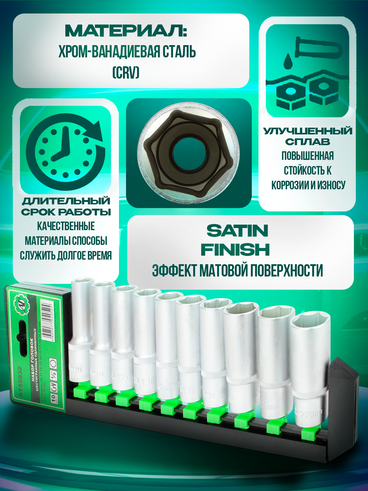 Набор головок шестигранных 1/2" удлиненных (10 шт.) информация: