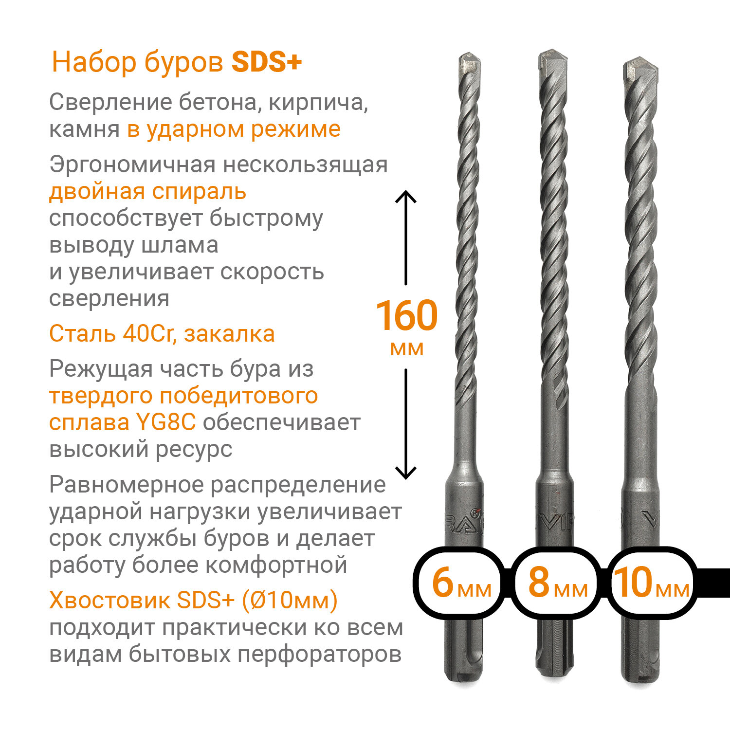 Набор буров по бетону rage by vira 564513 6/8/10х160мм sds-plus 642 ₽