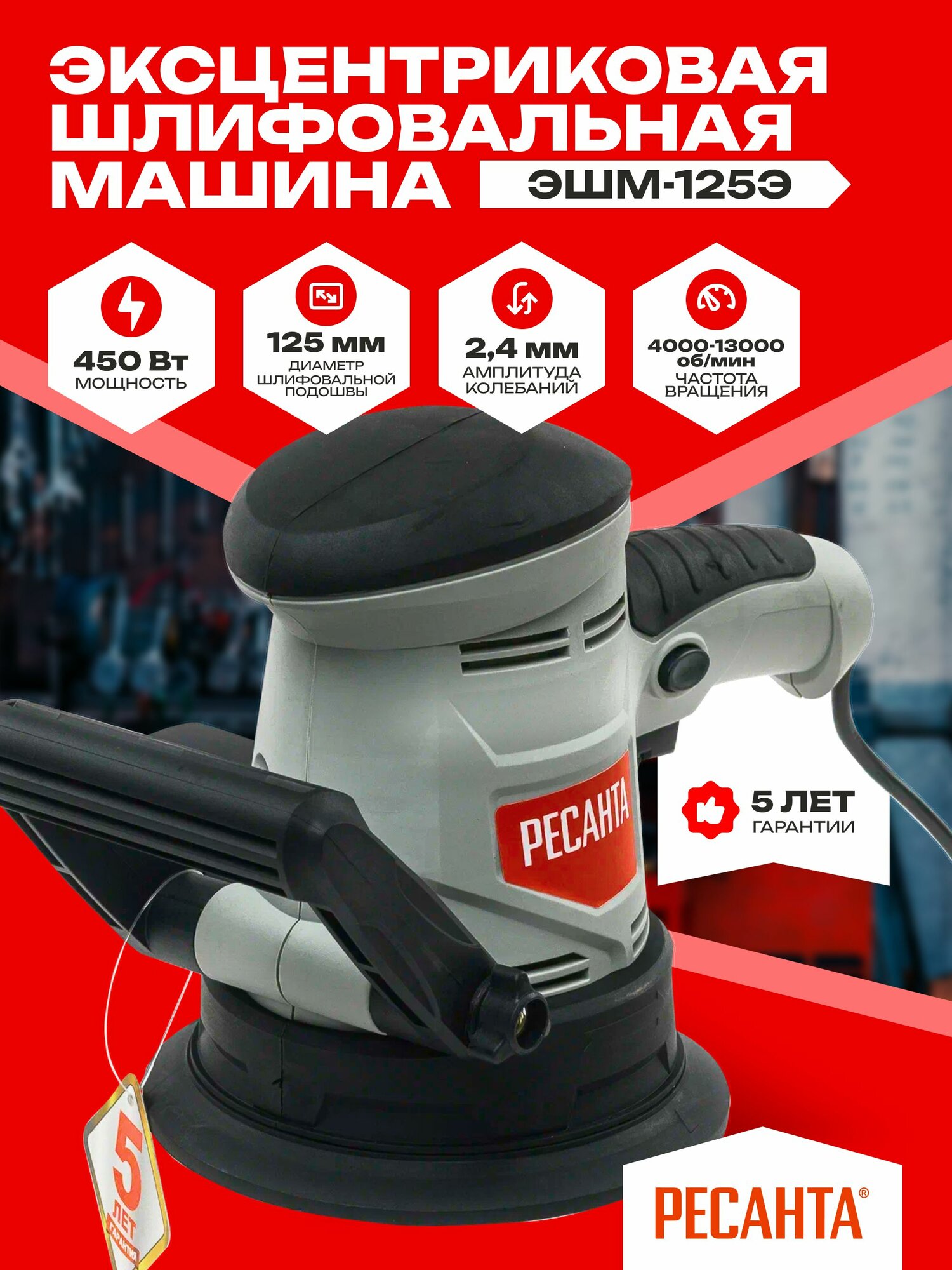 Эксцентриковая шлифовальная машина ЭШМ-125Э Ресанта, 450 Вт, амплитуда 2.4мм