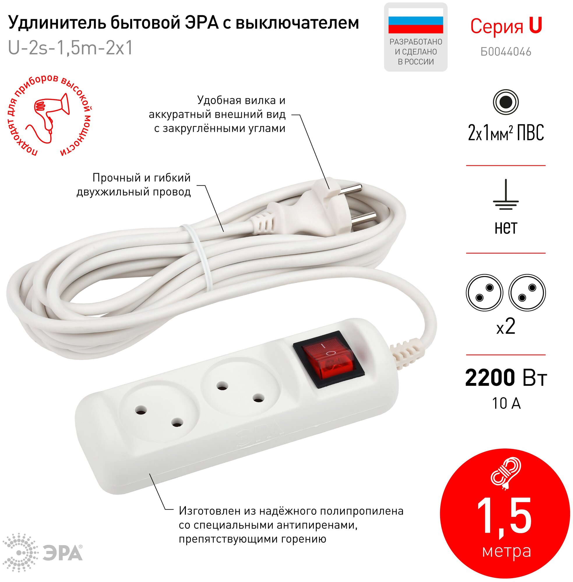 Удлинитель сетевой ЭРА U-2s-1,5m-2x1 без заземления, с выключателем, 2 розетки, 1,5м, 10А информация: