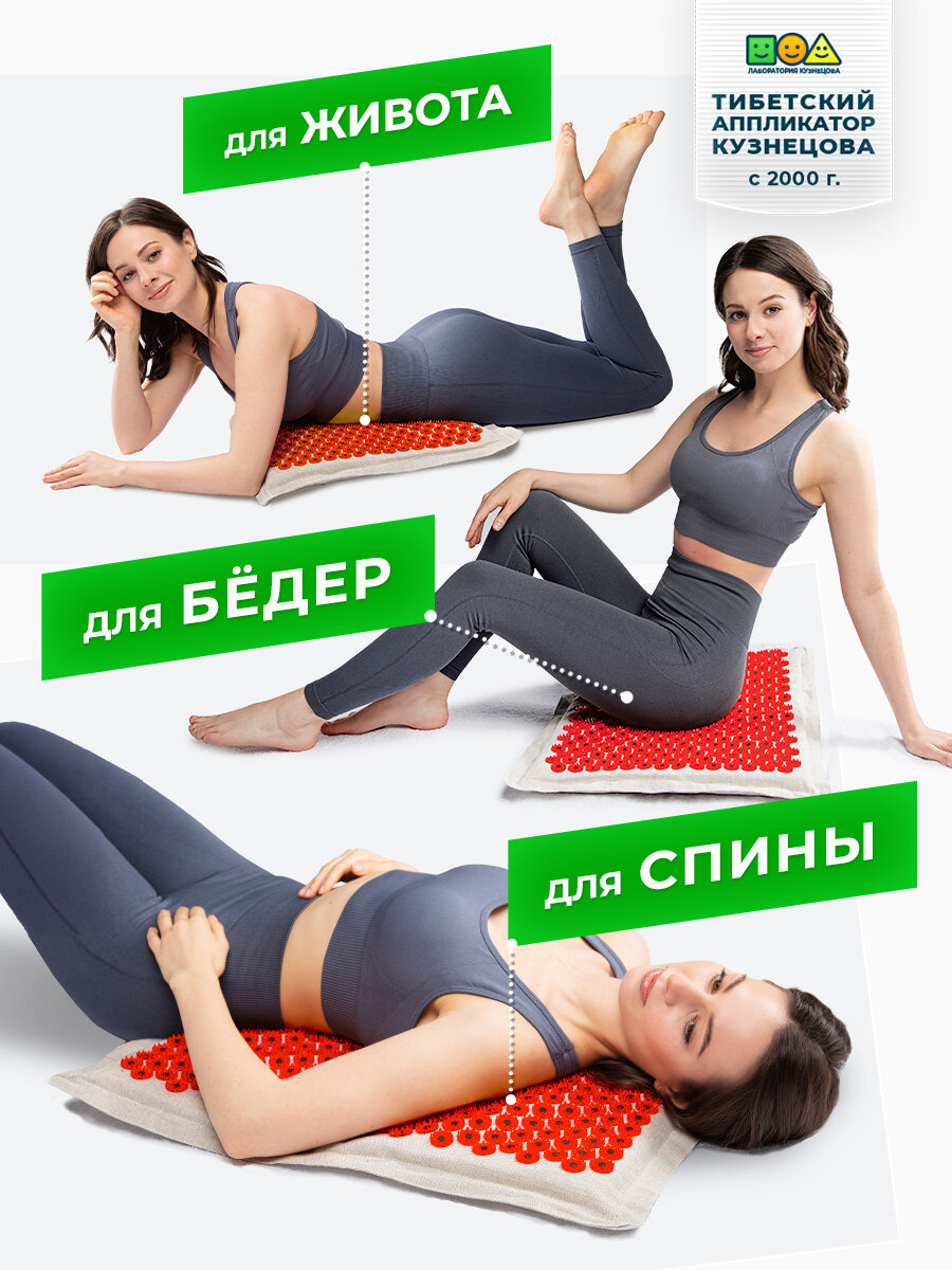 Аппликатор Кузнецова. Тибетский акупунктурный массажный коврик акупунктурный 41х60 см, массажер на мягкой подложке 2 см., красный (менее острые иглы, магнитные вставки). Цвет ткани - "натуральный лён"