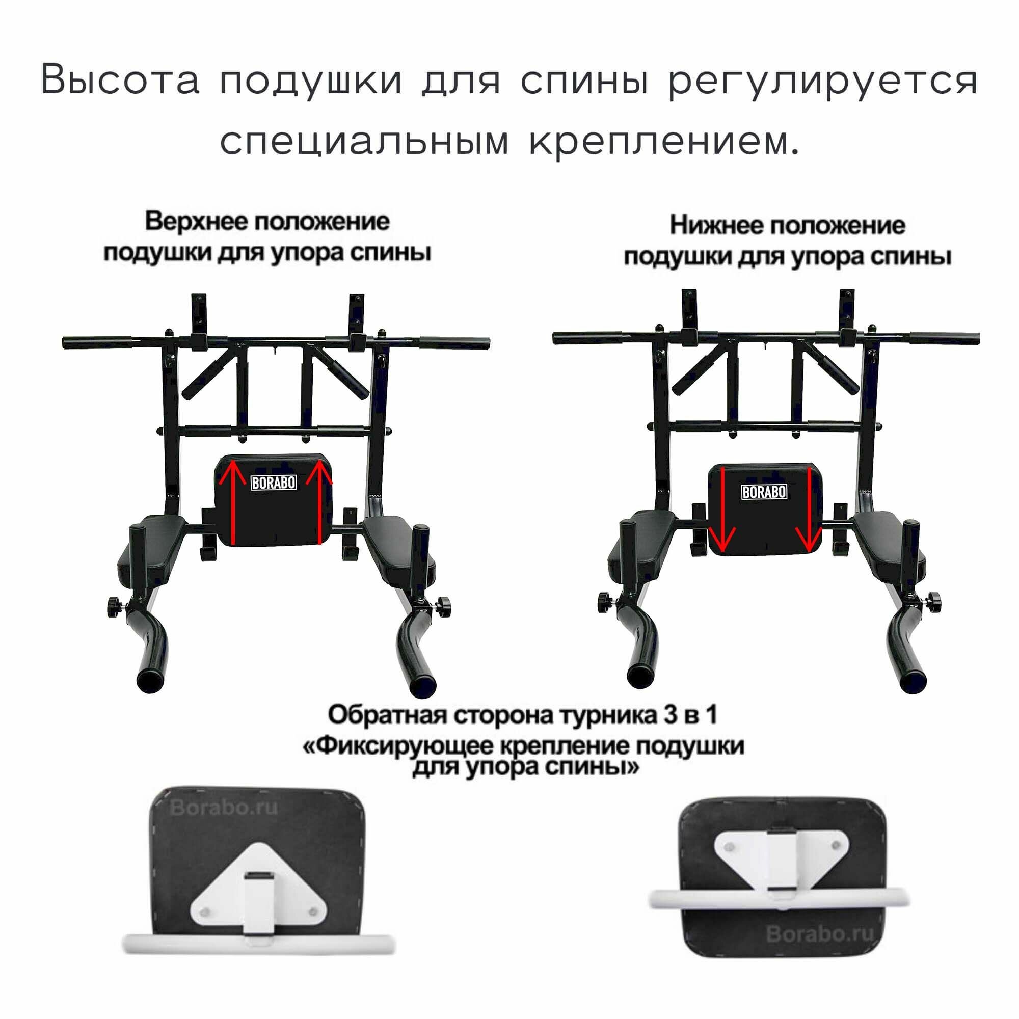| Дополнительные функции | мягкие подушки / регулировка по росту / съемный / ручки для хвата / крепление для боксерской груши / разборный / разные положения для хвата / работа с прессом / противоскользящие ручки |