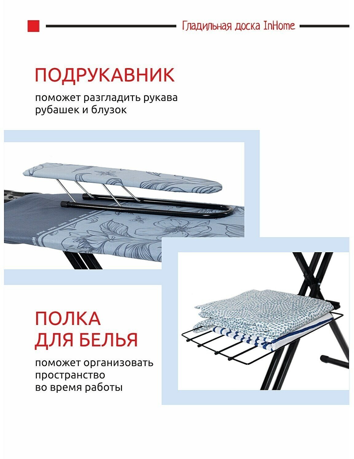Доска гладильная InHome IN9M/4Т(1220х400 мм), подрукавник, удлинитель, полка, тефлон (серые цветы) информация: