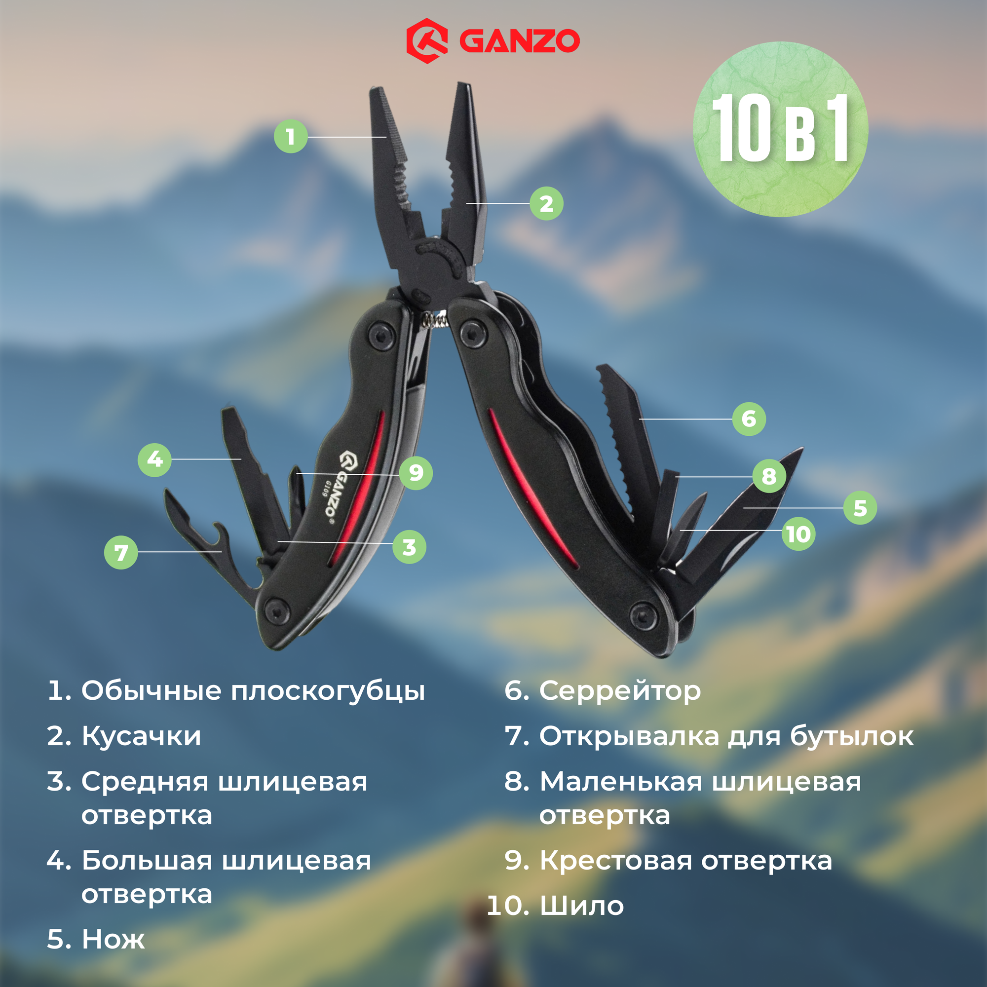 10 цен на Мультитул складной черный, многофункциональный 10 в 1 Ganzo G109