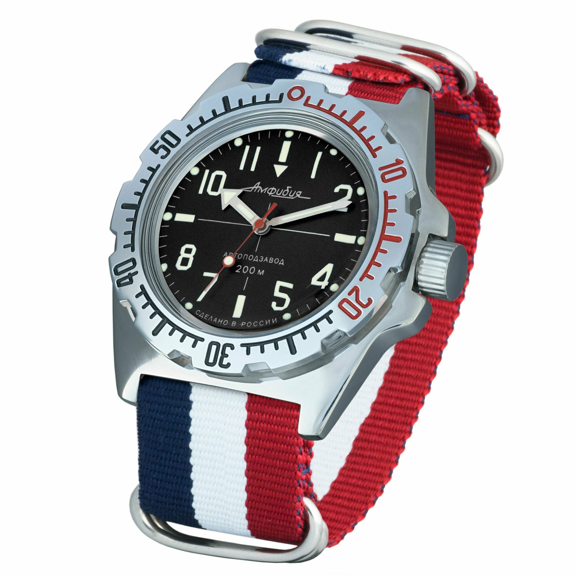 Часы наручные мужские механические с автоподзаводом Восток Амфибия 110647_tricolor3, нейлон, триколор (3 полосы) информация: