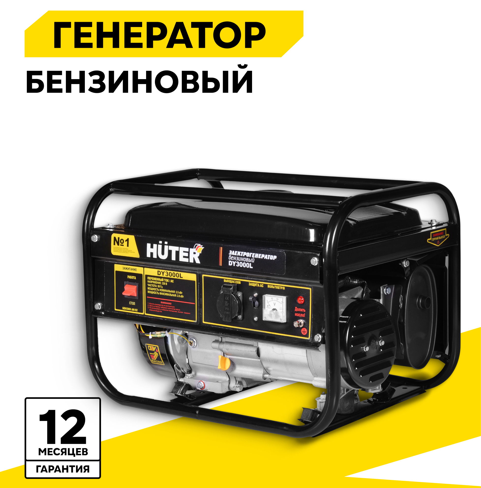 Генератор бензиновый HUTER DY3000L с ручным запуском с максимальной мощностью 2800 Вт информация: