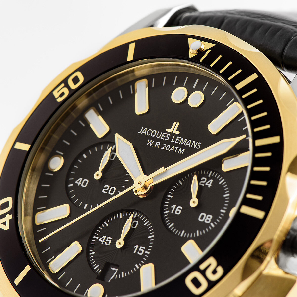 10 цен на Наручные часы Jacques Lemans 1-2091D, мужские кварцевые спортивные часы Жак Леман с хронографом и датой на комбинированном ремне (силикон и кожа)