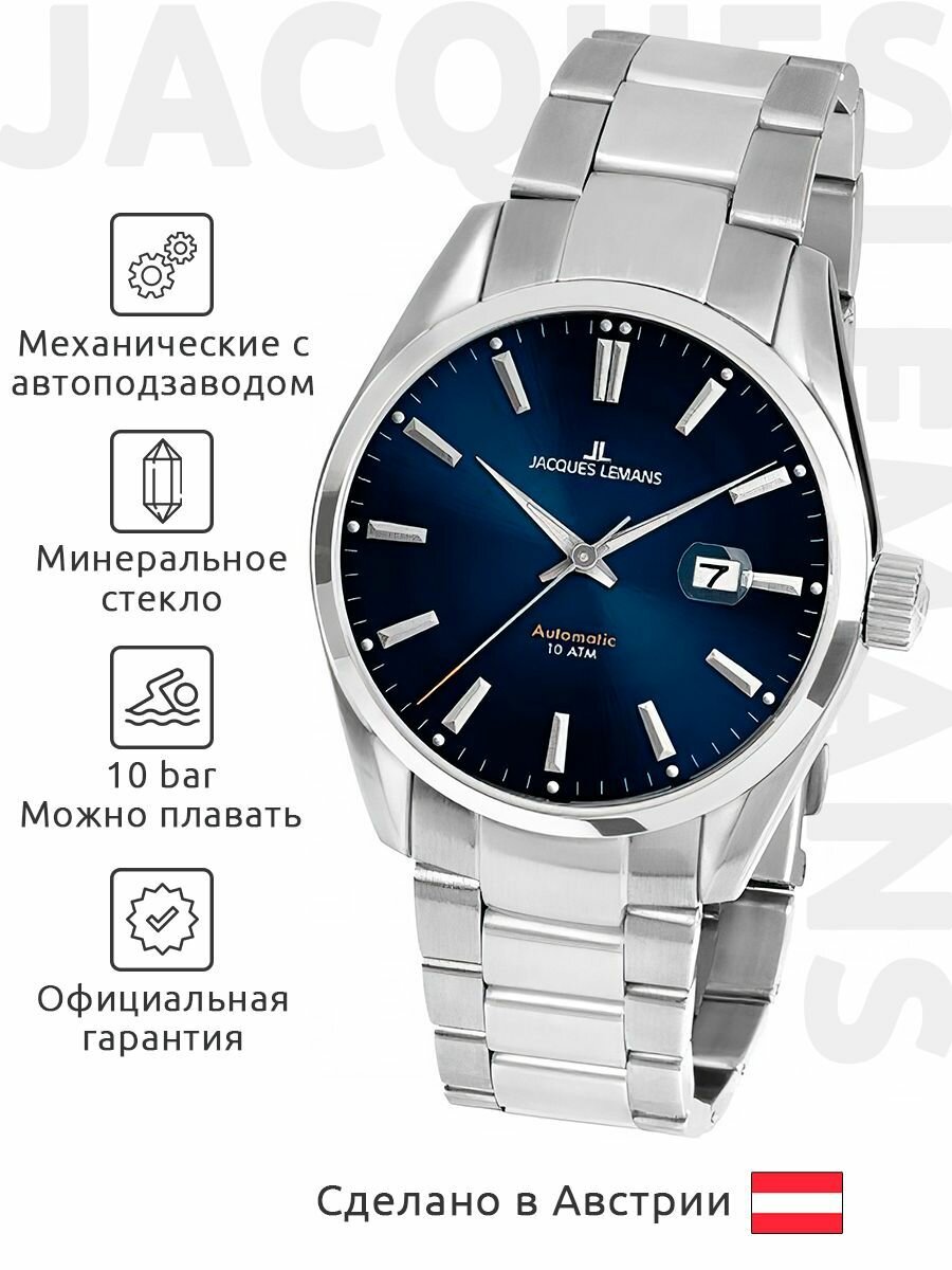 Наручные часы Jacques Lemans 1-1846D, мужские механические с автоподзаводом классические часы Жак Леман с датой на литом стальном браслете