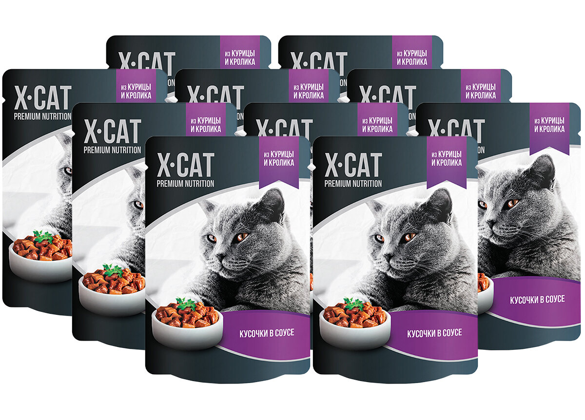 10 цен на X-CAT для взрослых кошек с курицей и кроликом в соусе 85 гр пауч 85 гр х 10 шт