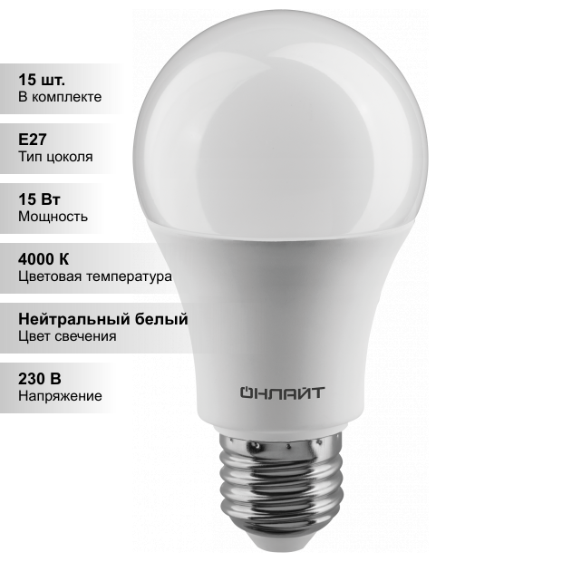 Лампа светодиодная ОНЛАЙТ 82921, E27, A60, 15 Вт, 4000 К