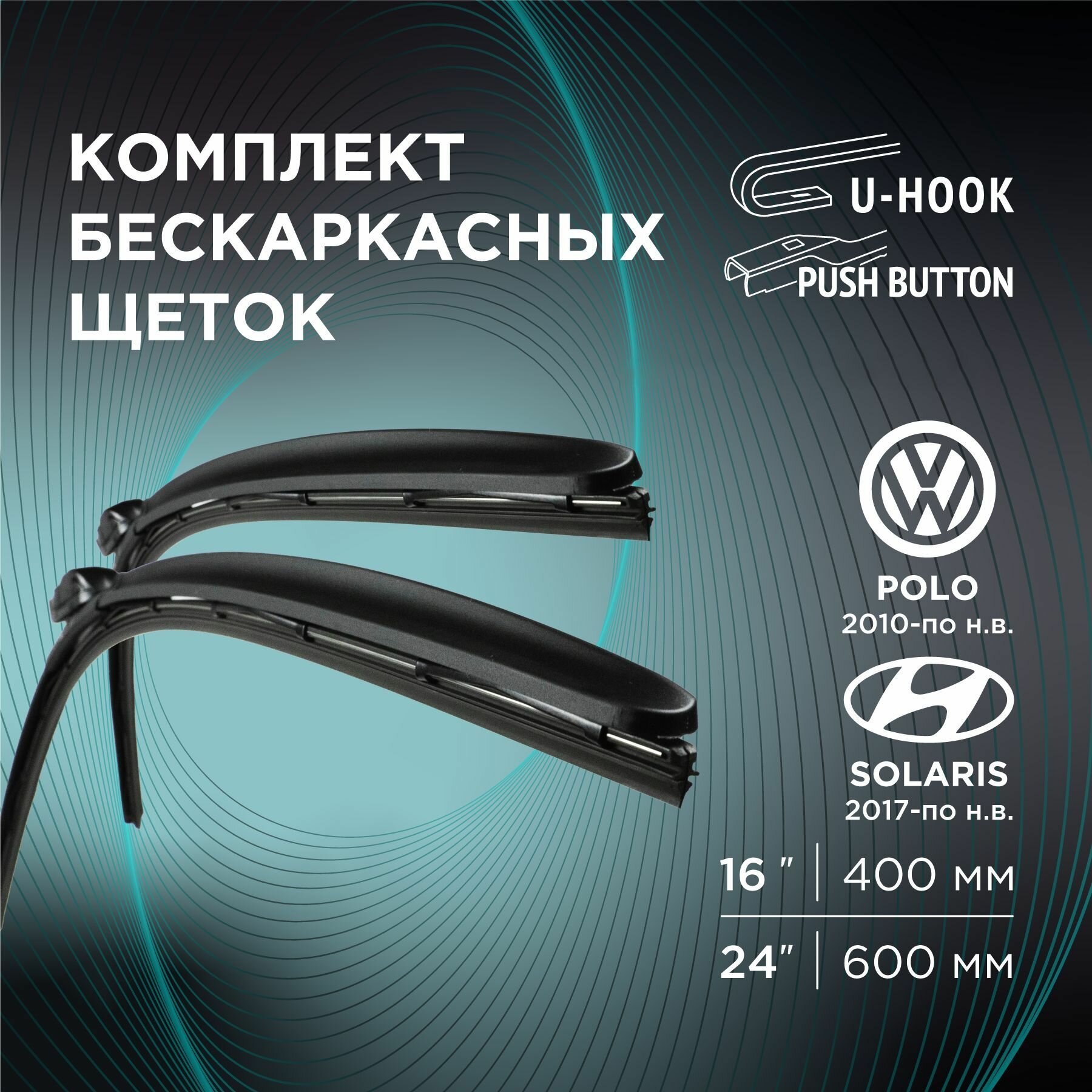 Комплект щеток стеклоочистителя, дворники автомобильные бескаркасные 600 мм/24"+400 мм/16" (HYUNDAI SOLARIS/Volkswagen POLO) с креплением "HOOK" WOG, 2 шт.