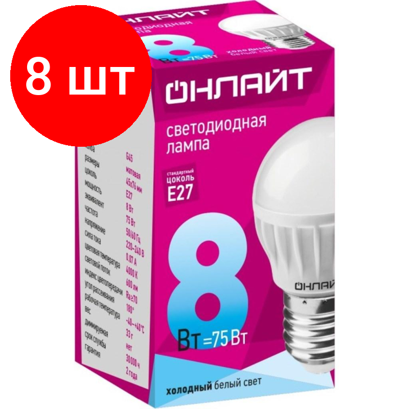 Комплект 30 штук, Лампа светодиодная онлайт OLL-G45-8-230-4K-E27 8Вт Е27 4000К 71627 4 402 ₽