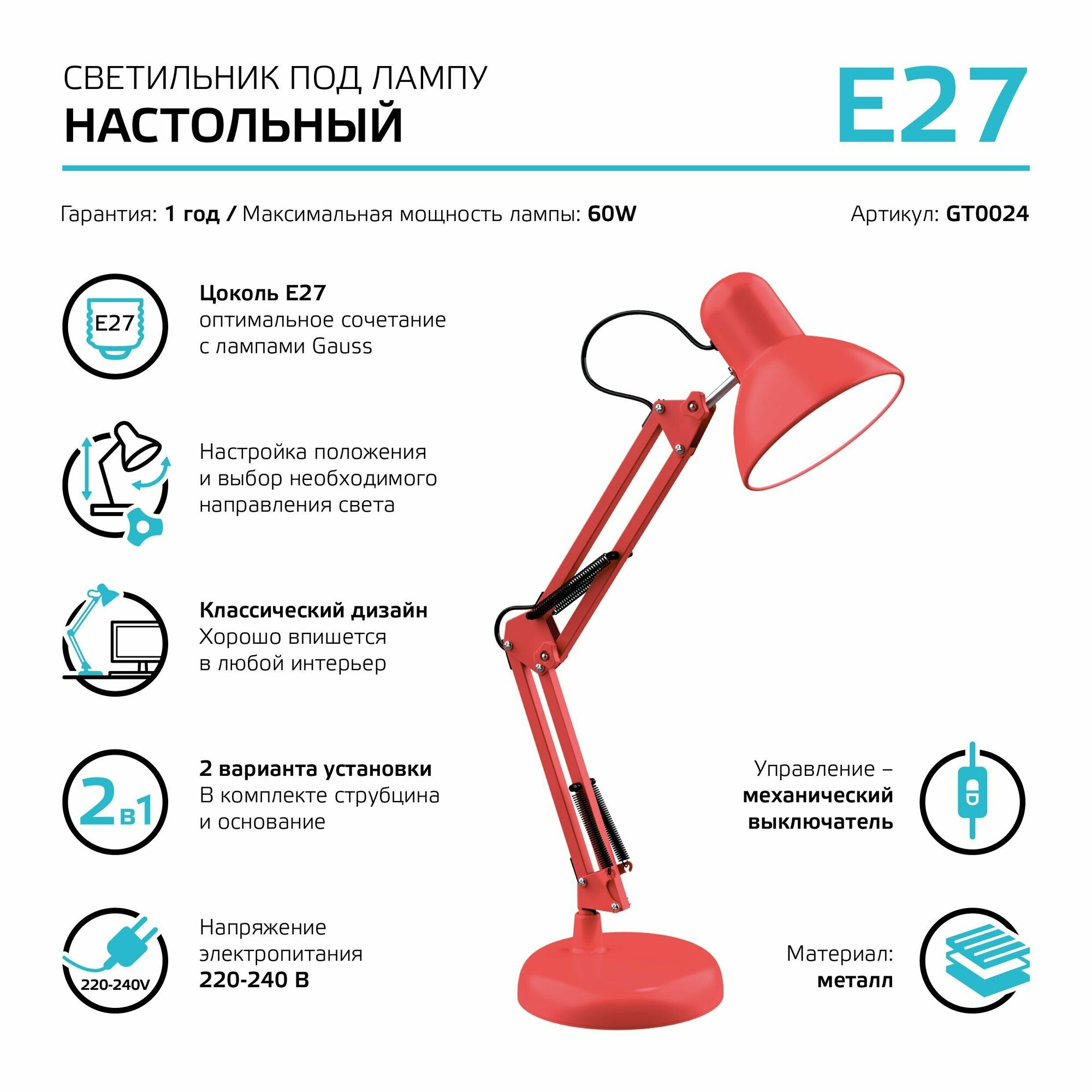 Светильник настольный Gauss GTL002 60W 220-240V E27 красный струбцина и основание