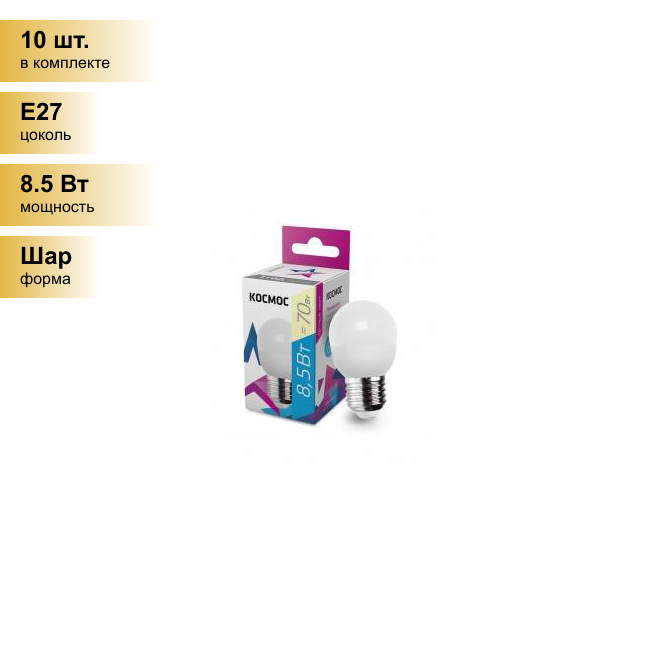 Светодиодная лампа Космос, 8.5 Вт, E27, 3000 K, шар, LED8.5wGL45E2730, теплый белый