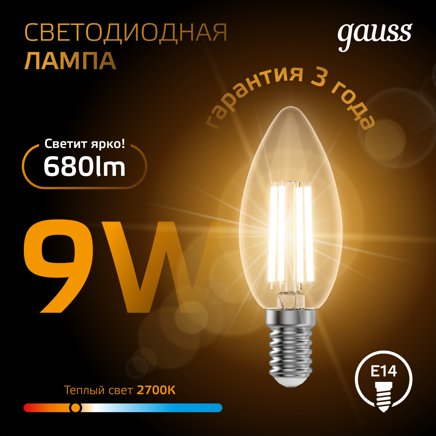 Лампа филаментная Gauss, 9Вт, цоколь E14, белый теплый, 2700К (10шт) (103801109) 1 780 ₽
