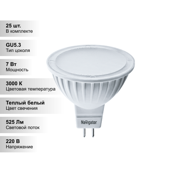 (25 шт.) Диммируемая светодиодная лампочка Navigator MR16, мощность 7 Вт, цветовая температура 3000 К, теплый белый свет, напряжение питания 220 В, цоколь GU5.3 информация: