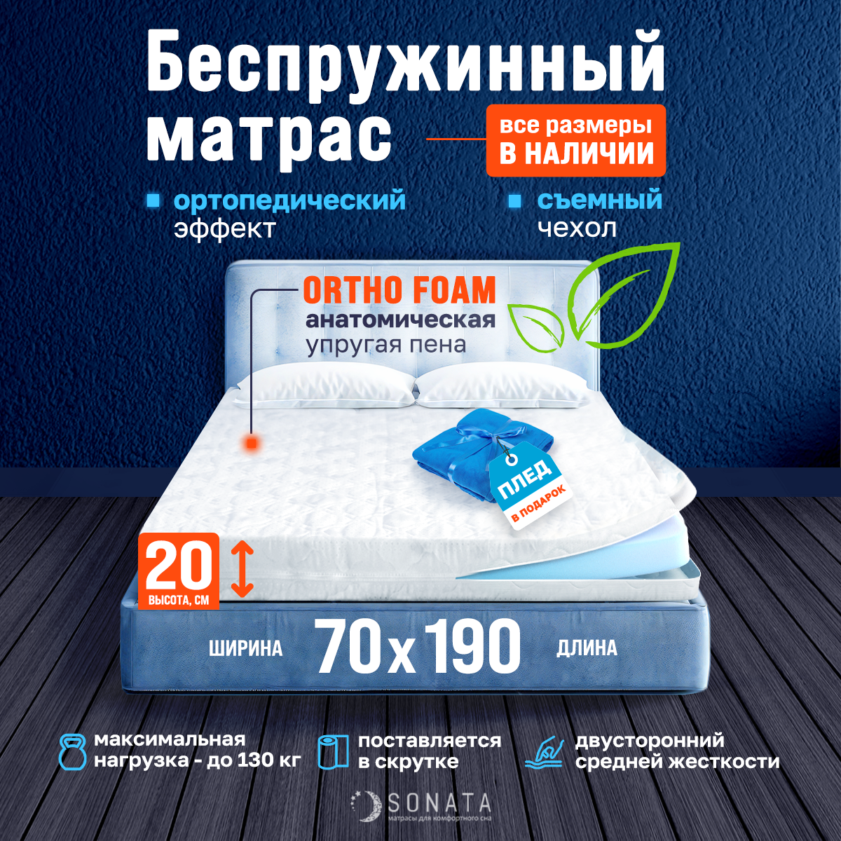 Матрас 70х190 см SONATA, Беспружинный, высота 20 см, Съемный чехол, Плед в подарок информация: