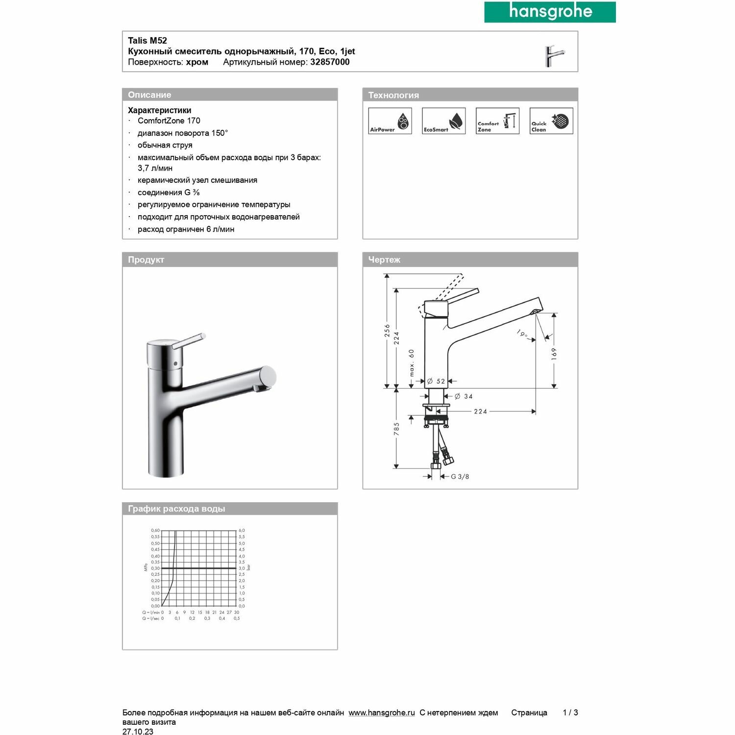 Смеситель для кухни 3,7 л/мин, хром Hansgrohe Talis M52 32857000 информация: